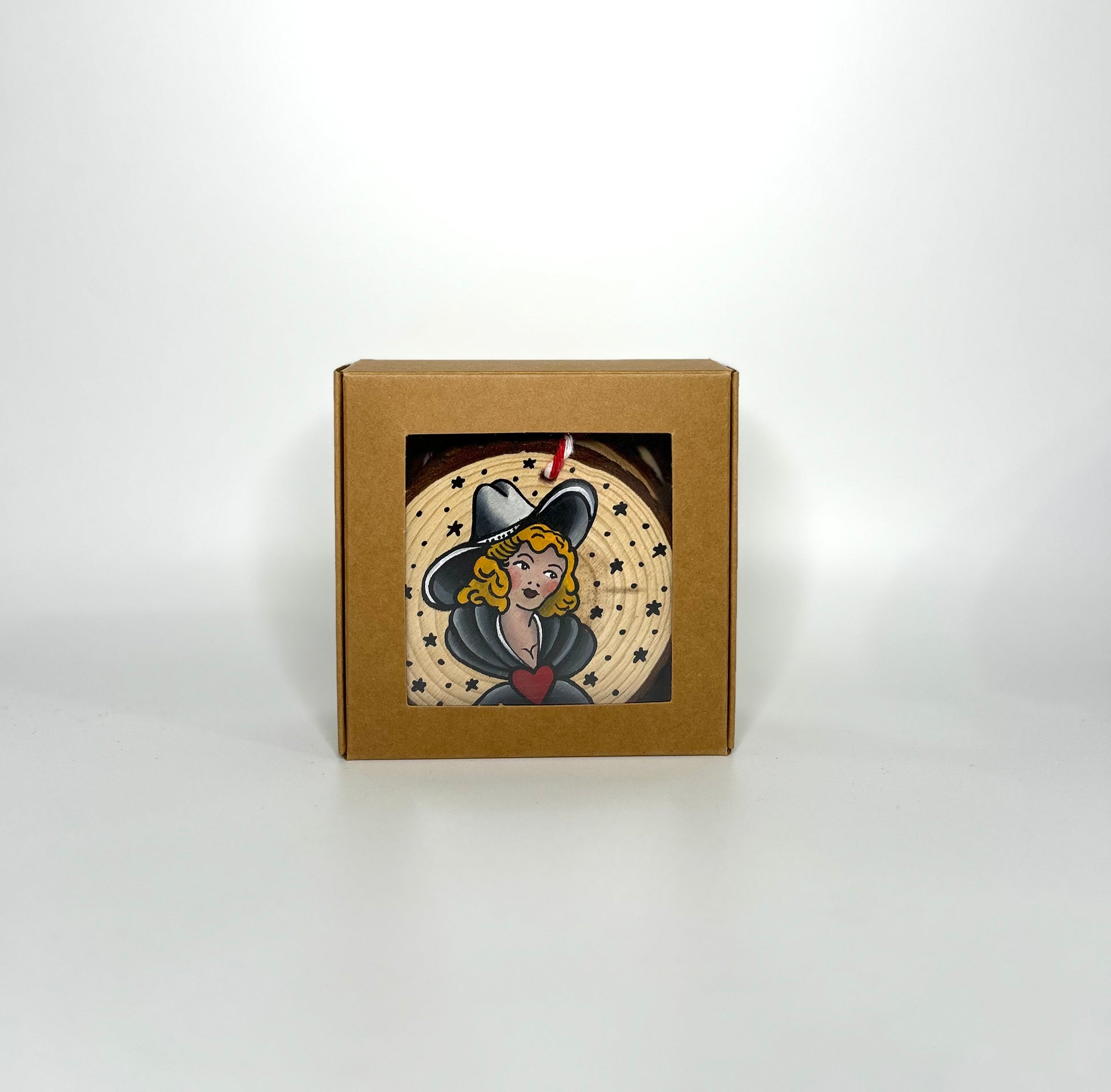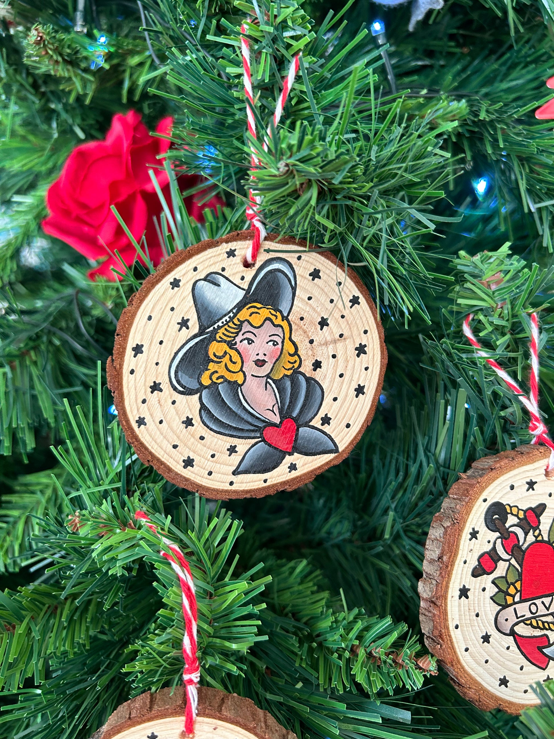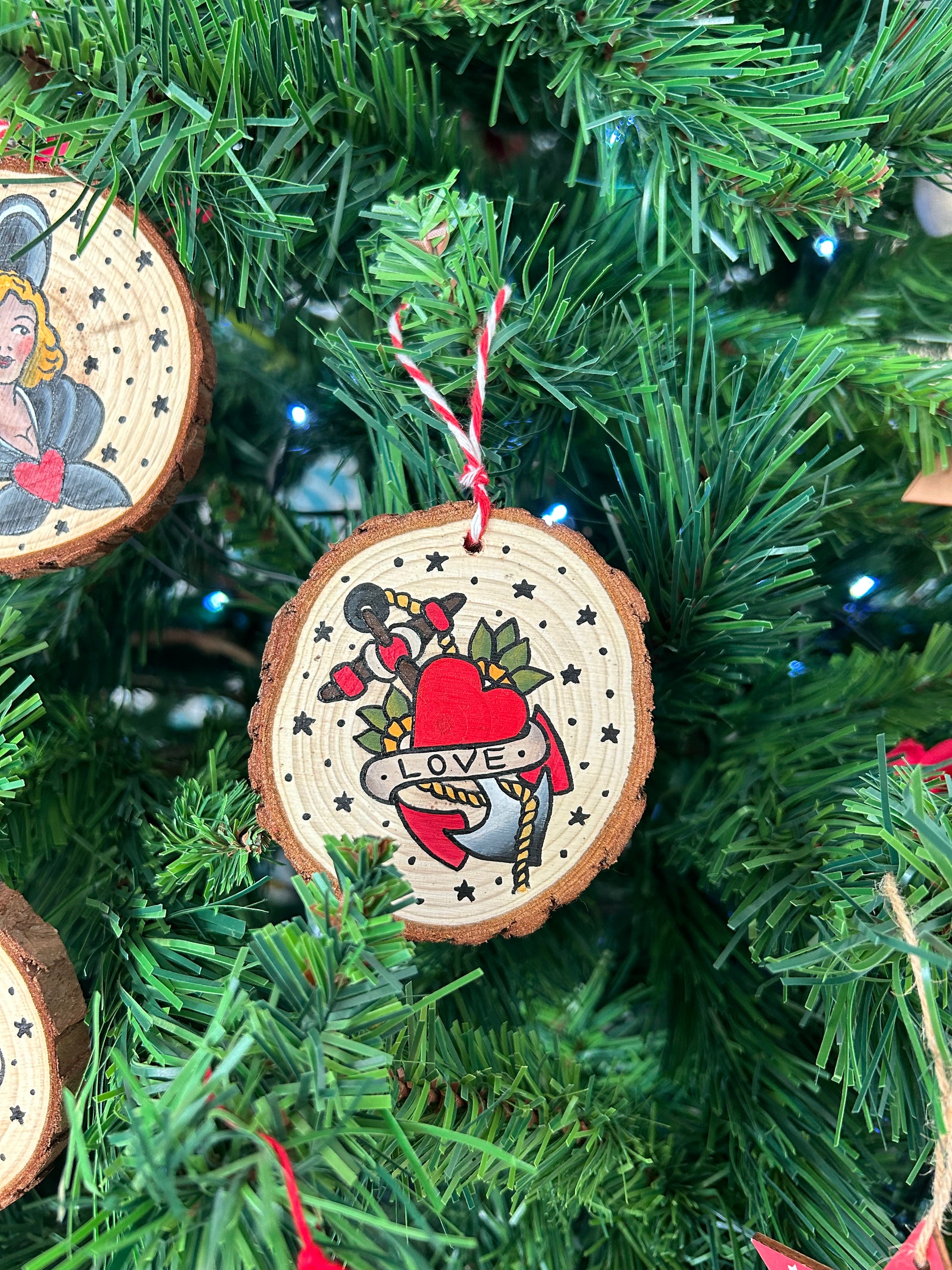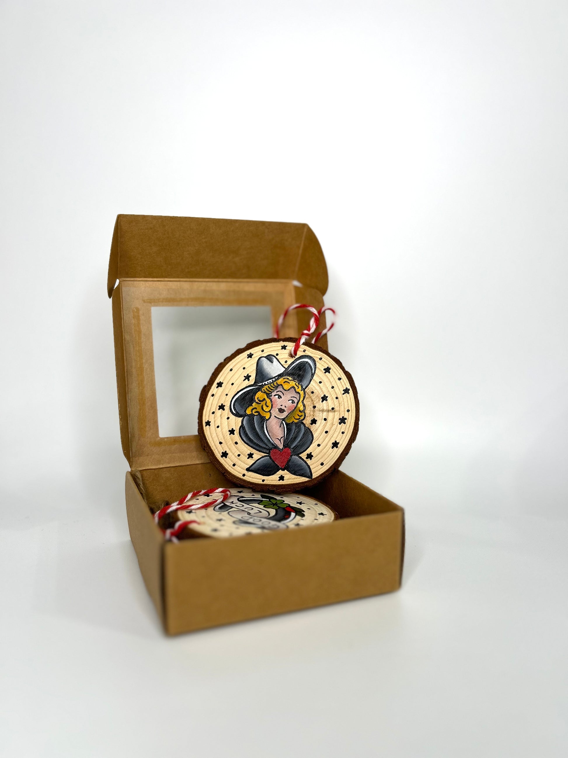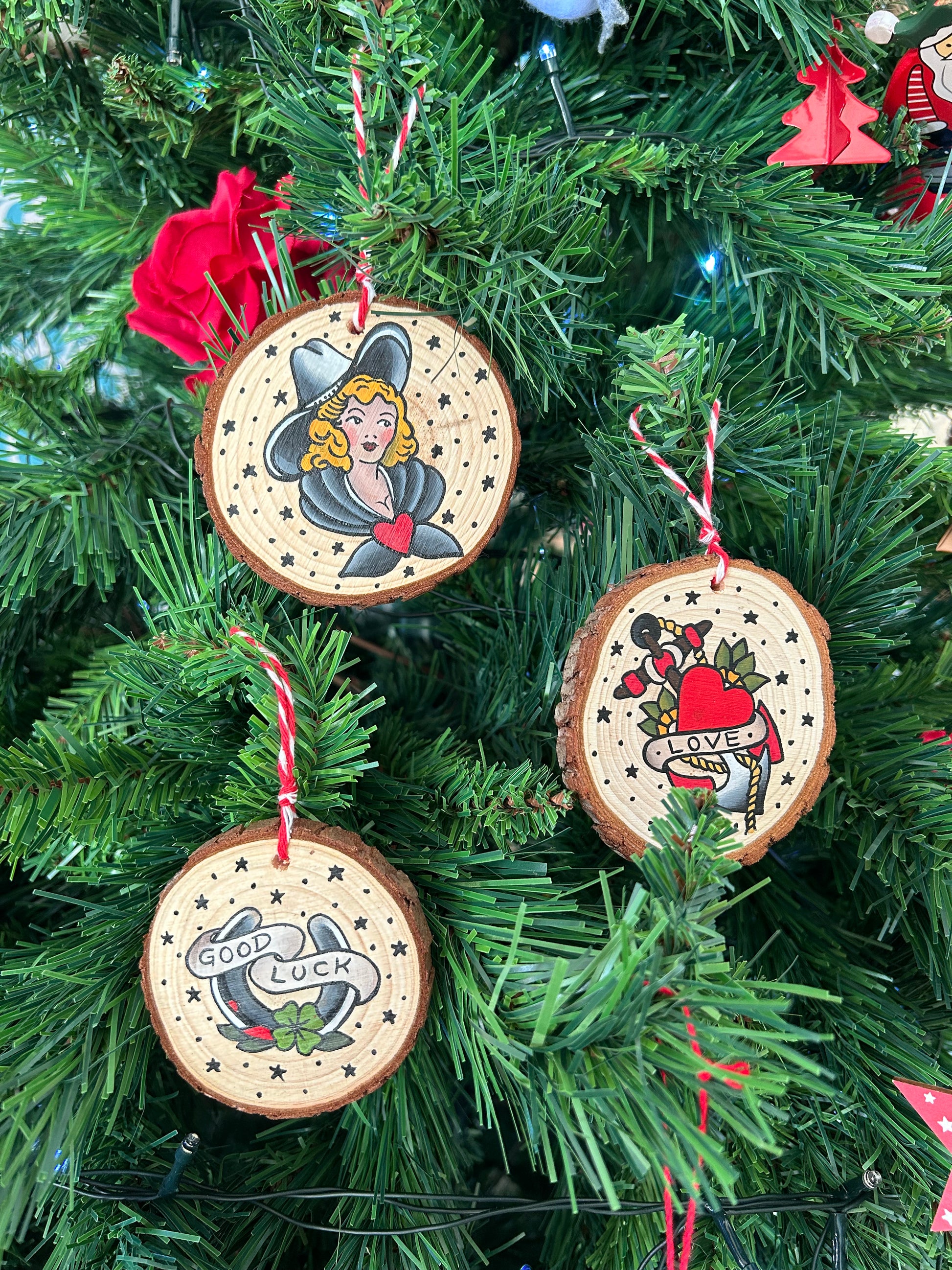 Set di tre dischetti in legno, dipinti a mano, utilizzabili come decori e segnaposto. Traditional Tattoo, sketch Sailor Jerry. Il set è confezionato in una scatola di cartone perfetto per essere regalato.